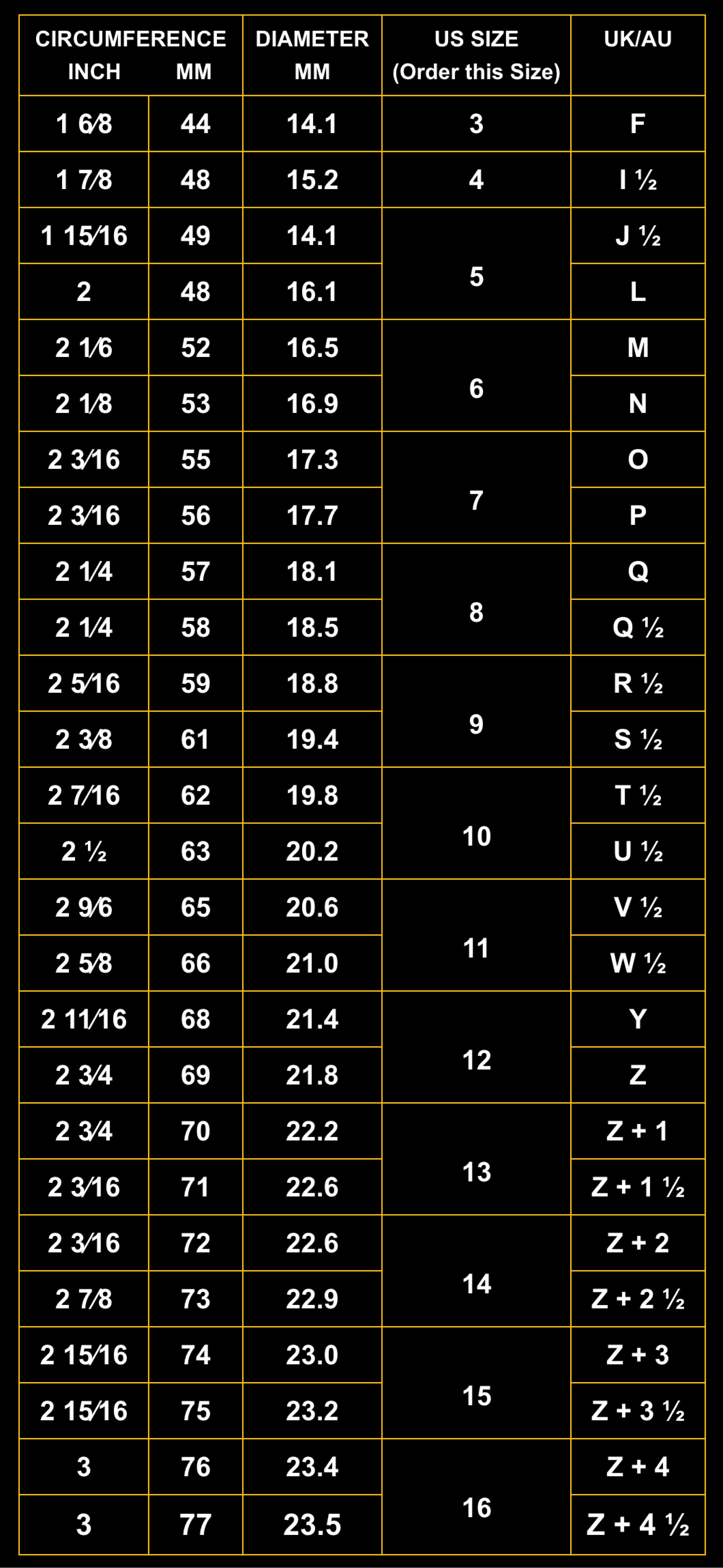 Measure the circumference and diameter of your finger. We use the US standard ring size in the third column